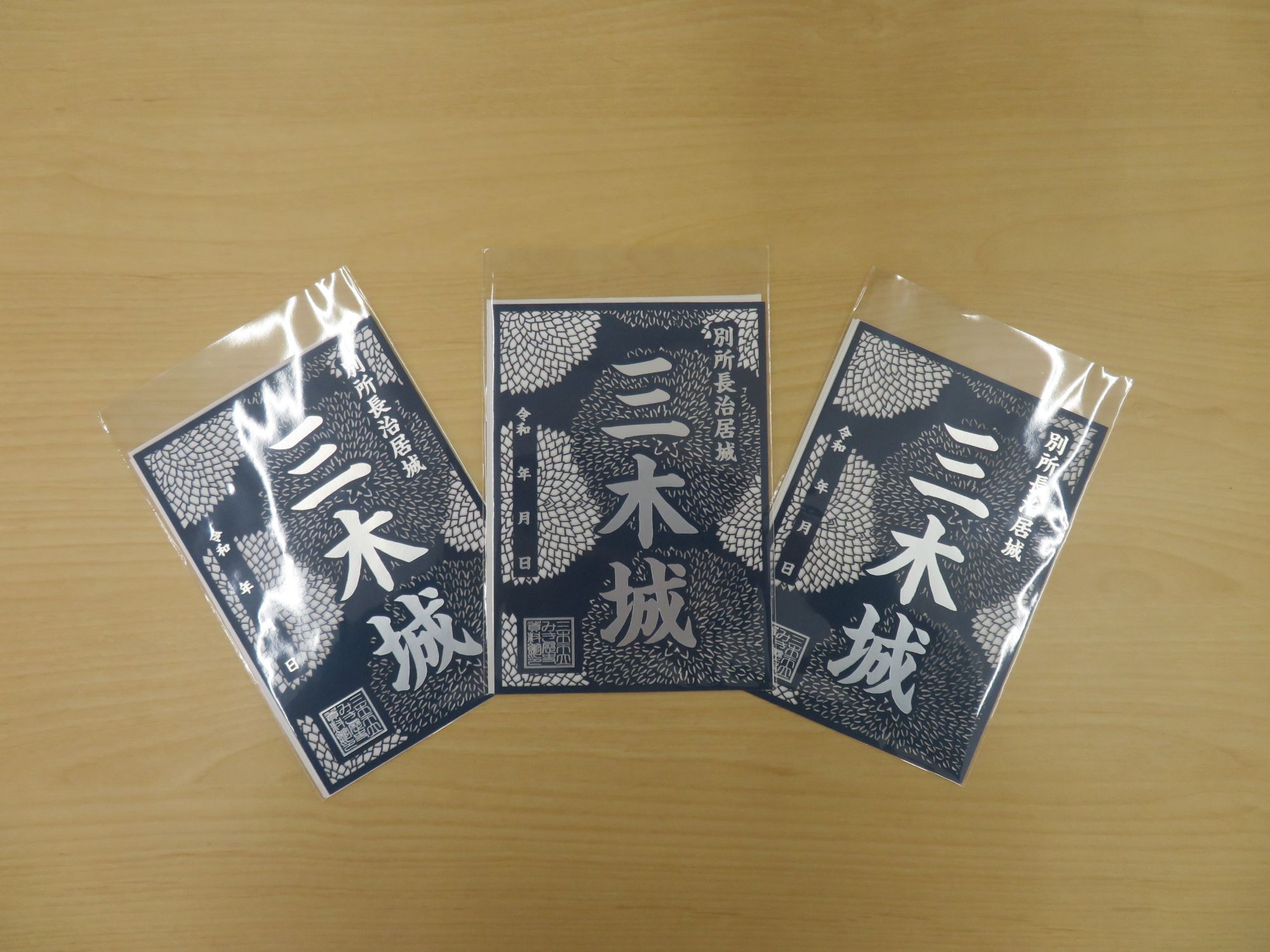 江戸時代に三木の特産品として広く知られていた染形紙での藍染めをイメージしたデザインの切り絵の「三木城御城印」を販売します。